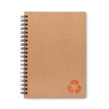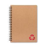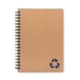 Caiet cu copertă din carton reciclat. Cu două fire. 140 de pagini liniate din hârtie minerală (70 de coli). Hârtia minerală este fabricată din carbonat de calciu și HDPE (rășină de polietilenă) folosit ca liant. Este impermeabilă și rezistentă la grăsimi.