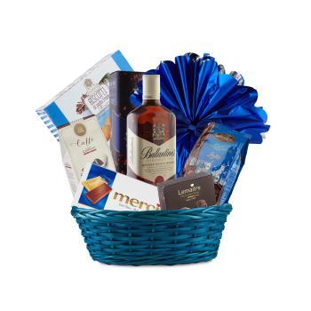 1. Whisky Ballantine’s 70cl 2. Panettone cu stafide şi coaja de portocala ambalat şi decorat manual SantAngelo 500g 3. Praline de ciocolata cu lapte Dolciaria Monardo 80g 4. Trufe de ciocolata belgiana cu fulgi de ciocolata si umplutura de trufe Lemaitre Meroso 35g 5. Tablete de ciocolata Merci 100g 6. Cafea macinata Corsini 100g 7. Fursecuri cu cocos Pasta Frolla Dolciaria Gadeschi 90g 8. Cos cadou 9. Cutie de transport