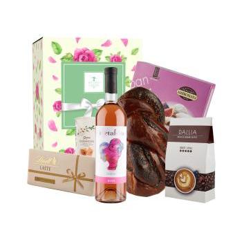 1. Cozonac cu nuca, cacao si rahat 400g 2. Fursecuri cu Crema de smochine Ambrosiana 140g 3. Tableta de ciocolata cu lapte Lindt 100g 4. Cafea macinata Dallia 100g 5. Vin roze Cabernet Sauvignon Metafora 75cl 6. Foietaj cu umplutura de cirese Cushions Grona 41g 7. Cutie cadou