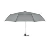 Umbrelă rezistentă la vânt de 27 inch cu 3 pliuri, deschidere/închidere automată. Material 190T pongee 190T, ax din oțel placat cu negru. Cadru din fibră de sticlă, placare neagră în 1 parte în interiorul cadrului. Mâner PP negru cu buton. Cu husă asortată.
